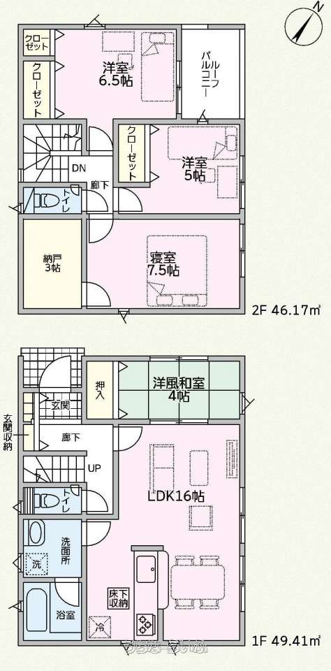 | 間取り | 4LDK ( 洋6.5 洋5 洋7.5 和4 LDK16 ※3帖の納戸・4帖の洋風和室) | ||