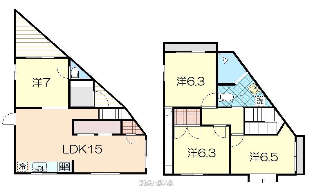 | 間取り | 4LDK ( 洋7 洋6.5 洋6.3 洋6.3 LDK15 ※トイレ2か所(1F/2F) ) | ||