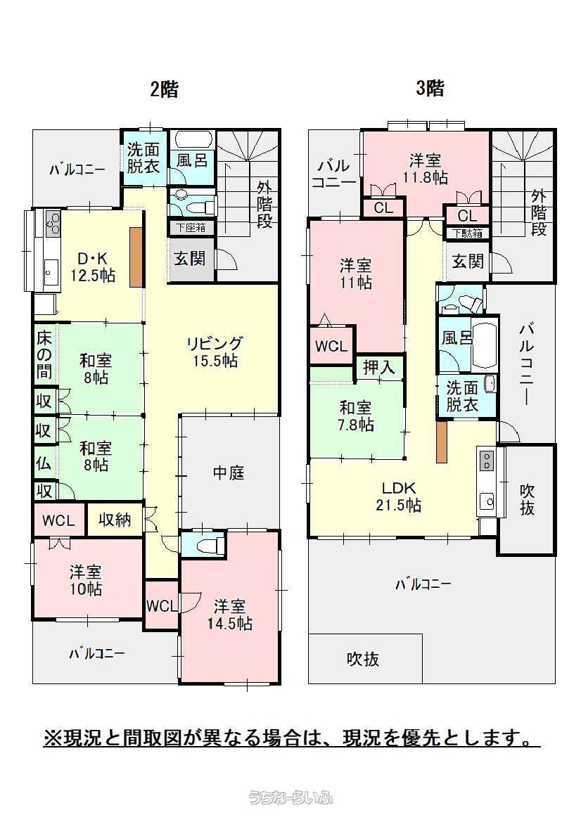 | 間取り | 7LDK ( 洋10 洋14.5 洋11 洋11.8 和8 和8 和7.8 LDK28 ※1階4LDK(トイレ2)・2階3LDK) | ||