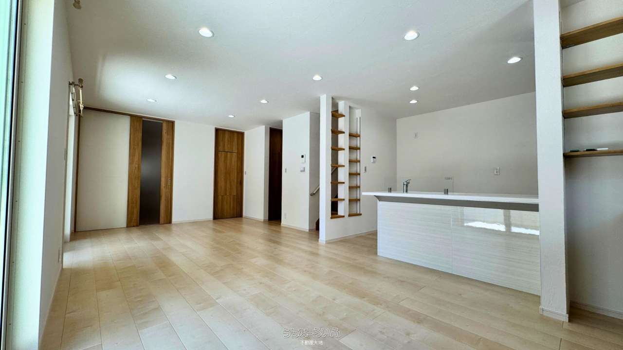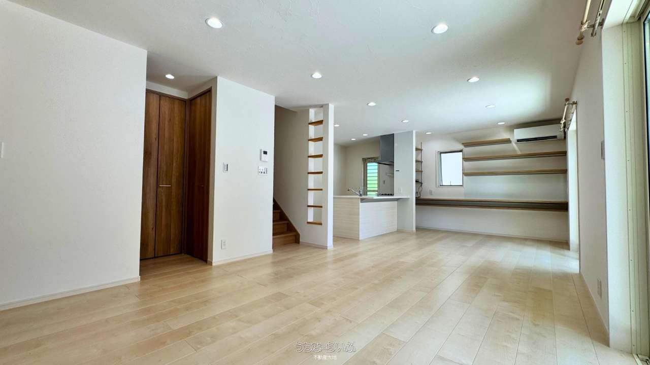 ※21帖超のリビングダイニングは、開放的な吹き抜けのような明るさと、無垢調フロアが織りなす上品な空間。2階にはゆとりある3つの洋室を配置し、プライベートと寛ぎを両立。