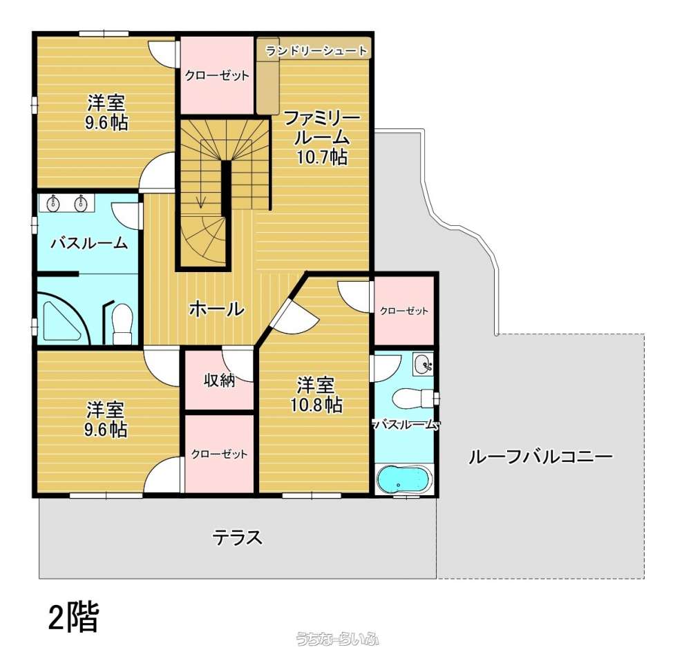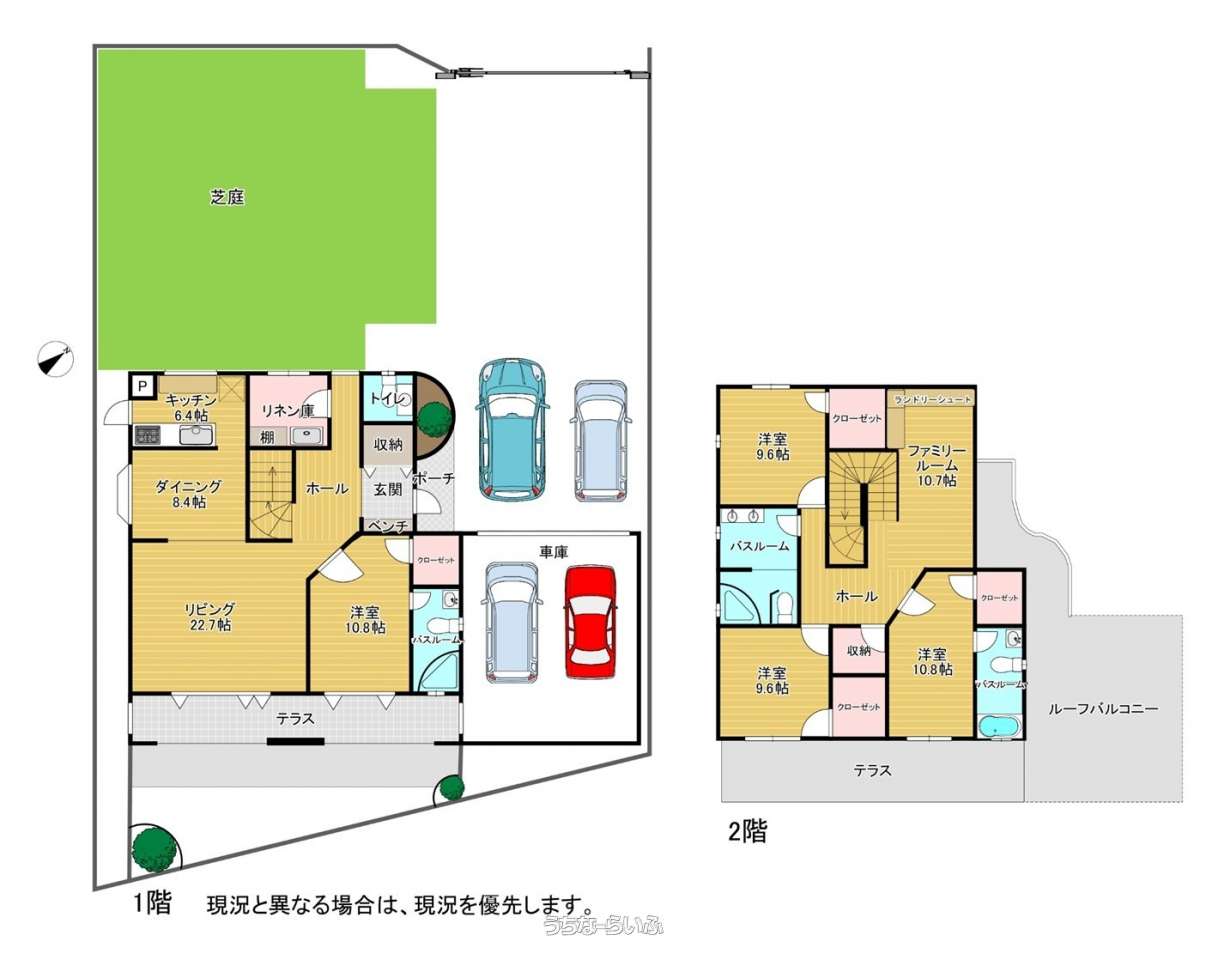 | 間取り | 4LDK ( 洋10.6 洋9.6 洋9.6 洋10.8 LDK37.5 ※LDK(キッチン6.4帖、ダイニング8.4帖、リビング22.7帖)、ファミリールーム10.7帖) | ||