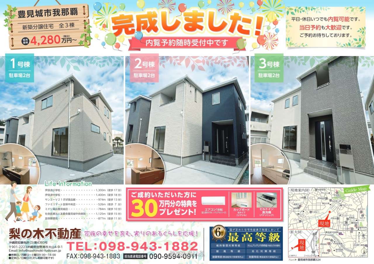 | 備考 | 2号棟:4,430万円 3号棟:4,280万円 〇新生活応援キャンペーン実施中!詳しい内容は担当者へお問い合わせください。 〇各金融機関への事前審査申込や本申込手続きをお手伝い致します。 その他不動産に関するお問い合わせもお待ちしております。 お気軽にお問い合わせください! ■現況: 完成済 |