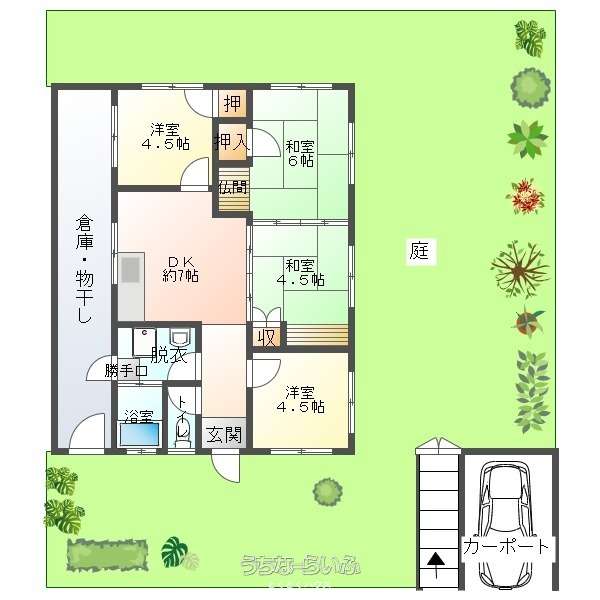 | 間取り | 4DK ( 洋4.5 洋4.5 洋6 洋6 DK7 ※目視確認となりますので、現状と異なる場合は現状優先となります。) | ||