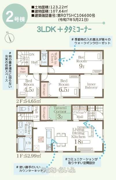 | 間取り | 3LDK ( 洋9 洋6.5 洋4.5 LDK18 ※畳コーナー3帖、全居室収納あり、WIC、インナーバルコニー) | ||
