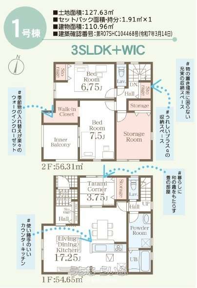 間取り | 3SLDK ( 洋7.5 洋6.7 和3.7 SLDK17.2 ※2階にストレージルームあり、全居室収納付き、インナーバルコニー) | ||
