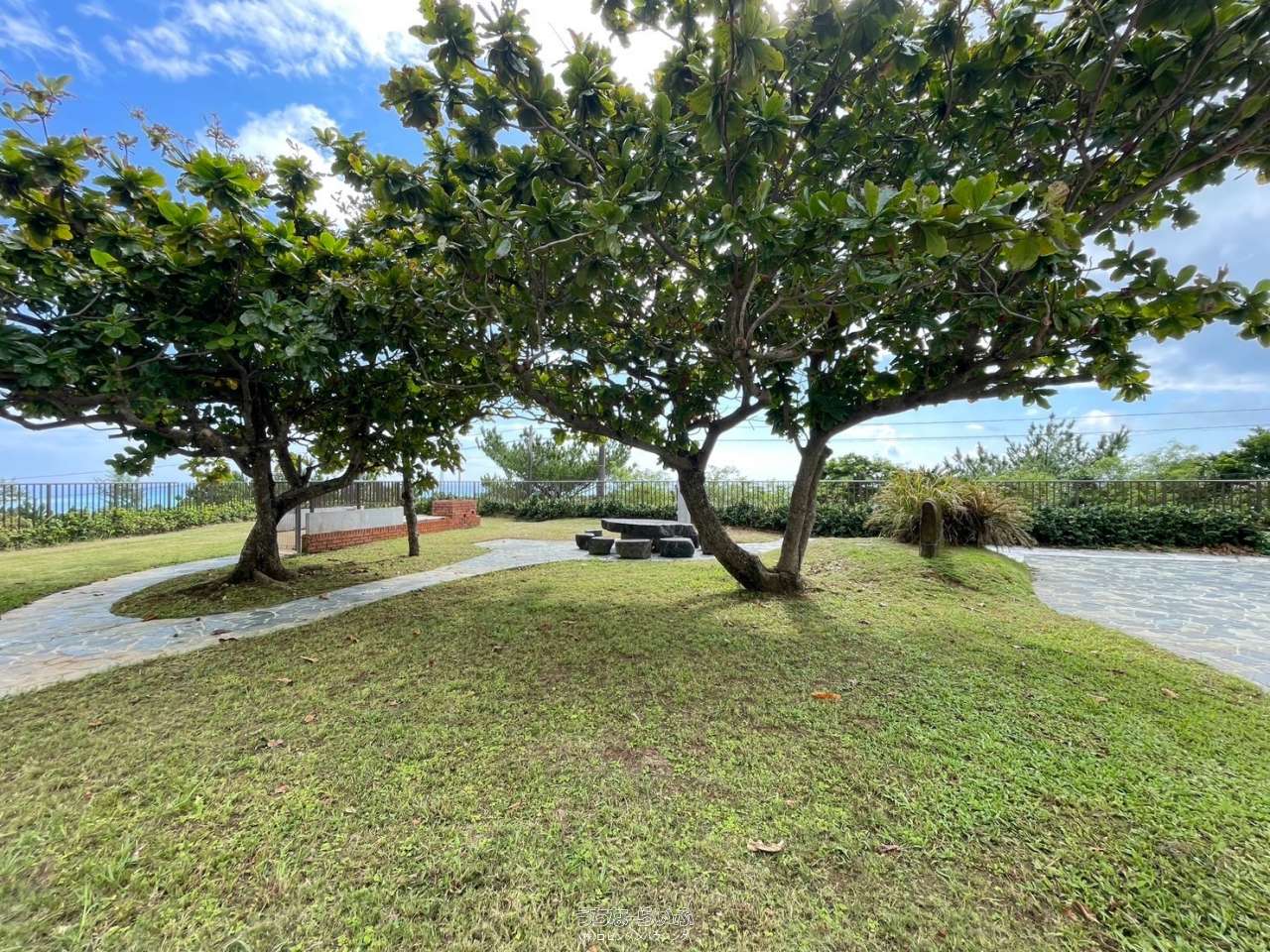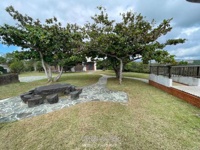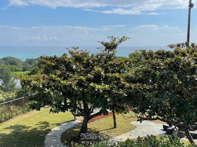大浦湾を一望できる広々ガーデン、東屋もあり、バーベキューなど楽しめます。夜には、星空を眺めてのグランピングなど如何ですか?