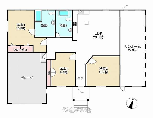 間取り | 3SLDK ( 洋15.6 洋9.2 洋10.7 SLDK29.8 ※3LDK+サンルーム+ビルトインガレージ+倉庫) | ||