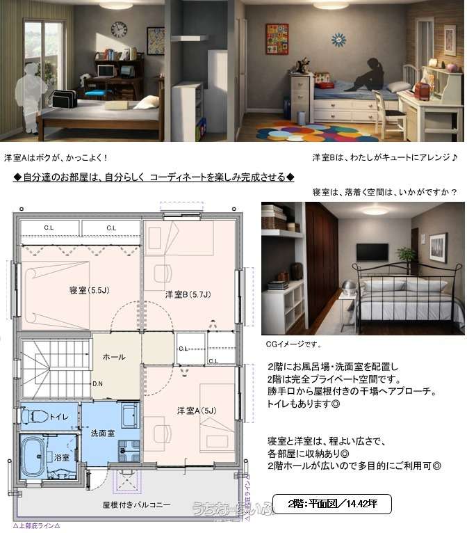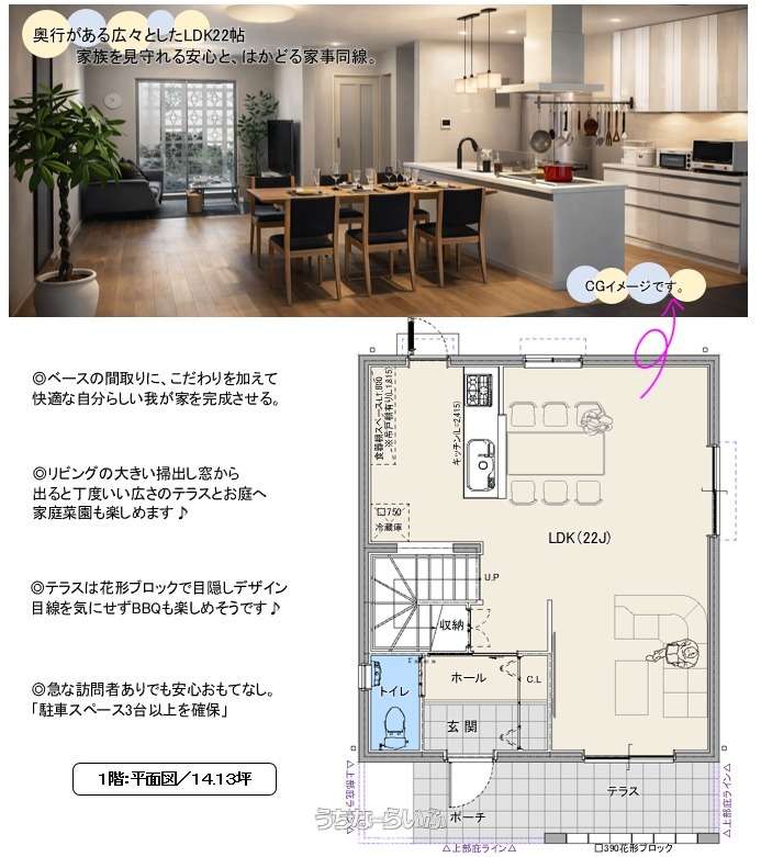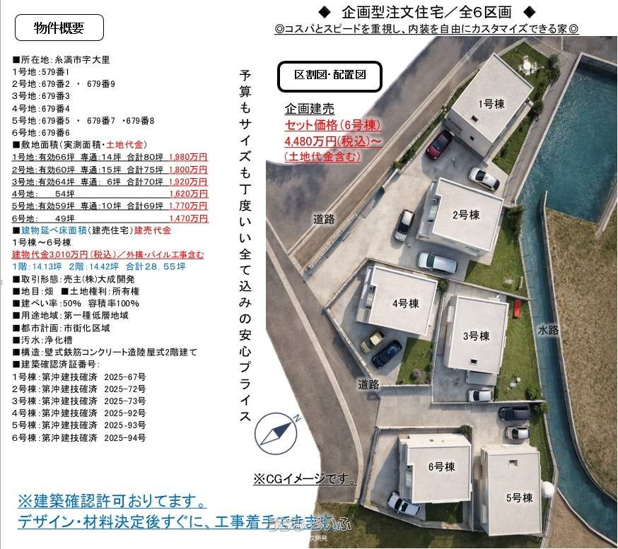 | 価格備考 | ■建物代金3,010万円(パイル工事・外構工事含む)+土地代金=セット価格になります。 ■土地代金/・1号地:66坪(1,980万円)・2号地:60坪(1,800万円)・3号地:64坪(1,920万円)・4号地:54坪(1,620万円)・5号地:59坪(1,770万円)・6号地:49坪(1,470万円) | ||