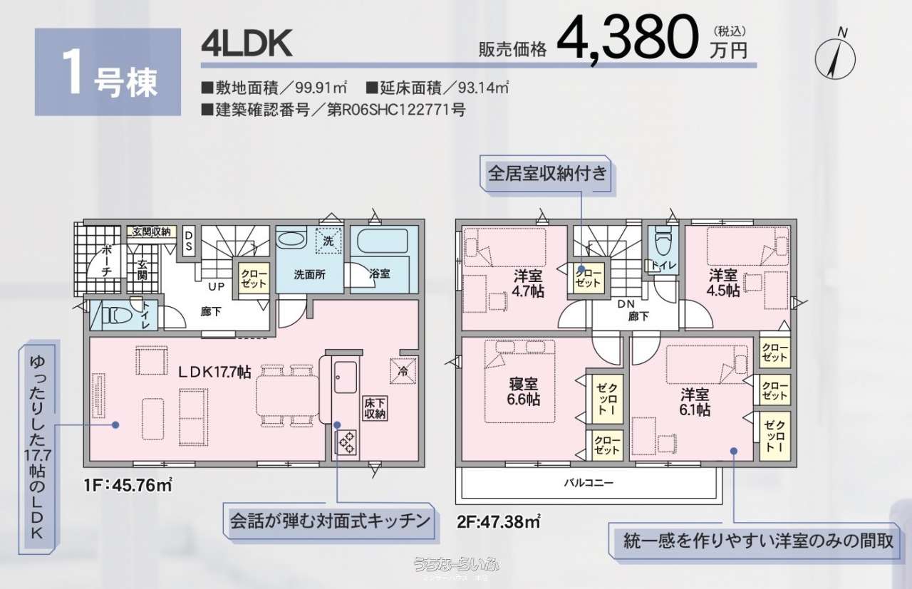 間取り | 4LDK ( 洋6.6 洋6.1 洋4.7 洋4.5 LDK17.7 ※年間4万棟以上の実績ある施工会社が考えぬいたこだわりのプランです!) | ||