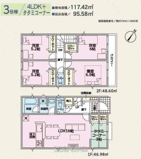 | 間取り | 4LDK ( 洋6.5 洋5.2 洋5.2 洋6 LDK16 ※畳コーナー、年間4万棟以上の実績ある施工会社が考えぬいたこだわりのプランです!) | ||