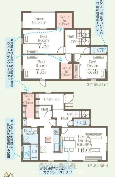 | 間取り | 3LDK ( 洋7.5 洋7.5 洋5.3 LDK16 ※インナーバルコニー) | ||