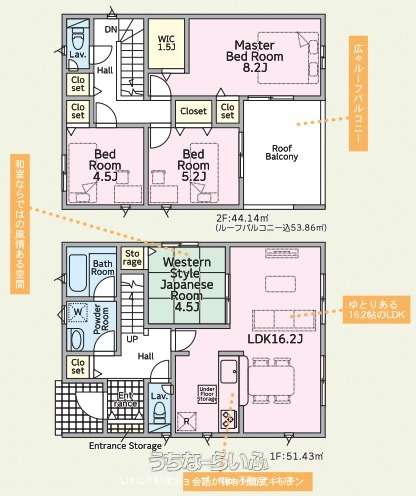 | 間取り | 4LDK ( 洋8.2 洋5.2 洋4.5 和4.5 LDK16 ※ルーフバルコニー・ウォークインクローゼット(1.5帖)) | ||