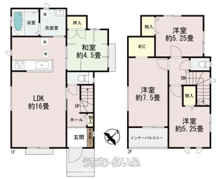 | 間取り | 4LDK ( 洋7.5 洋5.2 洋5.2 和4.5 LDK16 ※ウォークインクローゼット・インナーバルコニー) | ||