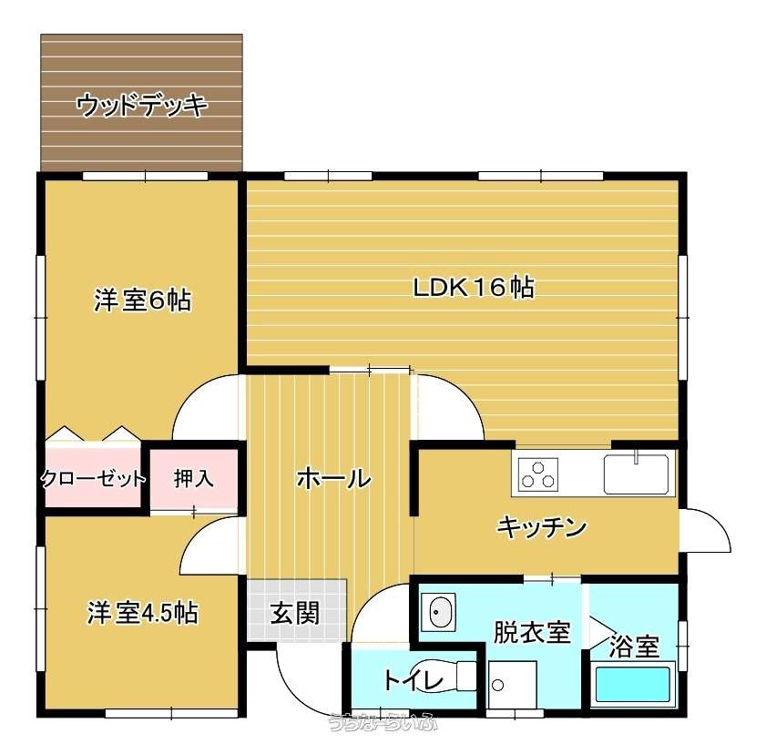 | 間取り | 2LDK ( 洋6 洋4.5 LDK16 ※ウッドデッキ付き、室内洗濯機置場、対面キッチン) | ||