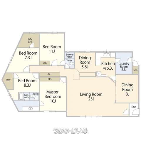 | 間取り | 4LDK ( 洋10 洋10 洋6 洋5 LDK23 ※各部屋に収納あり。上記「LDK」にキッチン面積は含まれません。別に独立キッチン6.3帖があります。) | ||