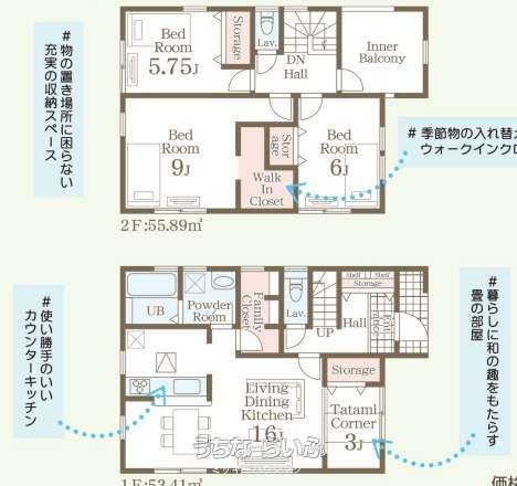 | 収納 | ウォークインクローゼット 、 シューズインクローク 、 シューズボックス 、 床下収納 、 全居室収納 、 階段下収納 |