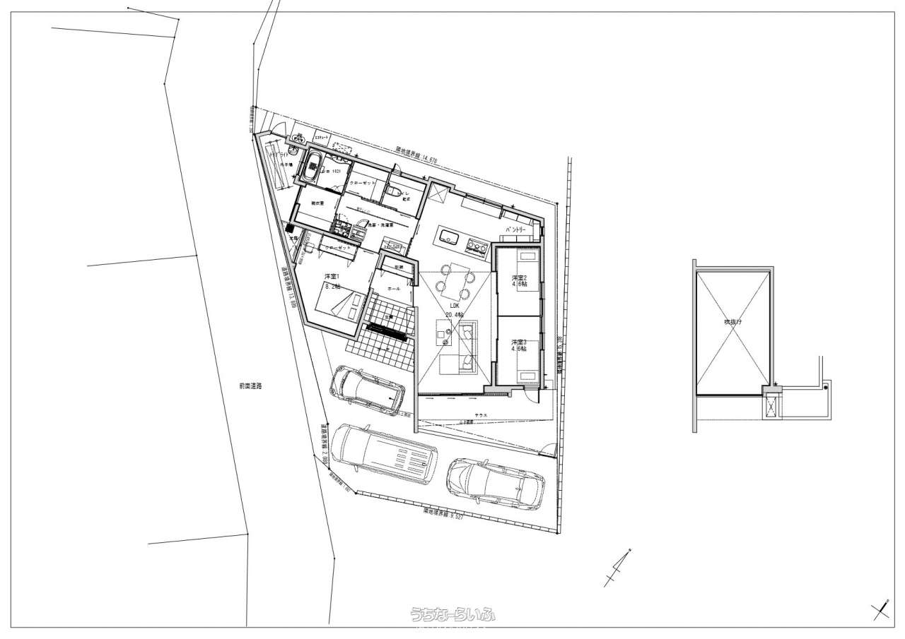 | 間取り | 3LDK ( 洋4.6 洋4.6 洋8.2 LDK20.4 ※シューズ収納とは別で玄関収納。オープンのパントリー。大容量のクローゼット。LDKに面した2部屋は、可動間仕切り戸で、間取り自由自在。) | ||