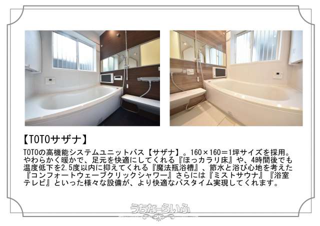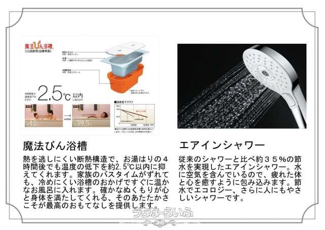 | バス・トイレ | バス/トイレ別 、 浴槽 、 独立洗面所 、 追焚機能 、 TV付浴室 、 トイレ2ヶ所 、 タンクレストイレ 、 温水洗浄便座 |