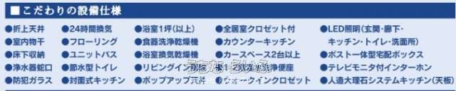 | 構造 | バリアフリー 、 制震構造 、 免震構造 、 耐震構造 、 外断熱工法 、 ノンホルムアルデヒド 、 長期優良住宅 、 低炭素住宅 、 二世帯住宅 |