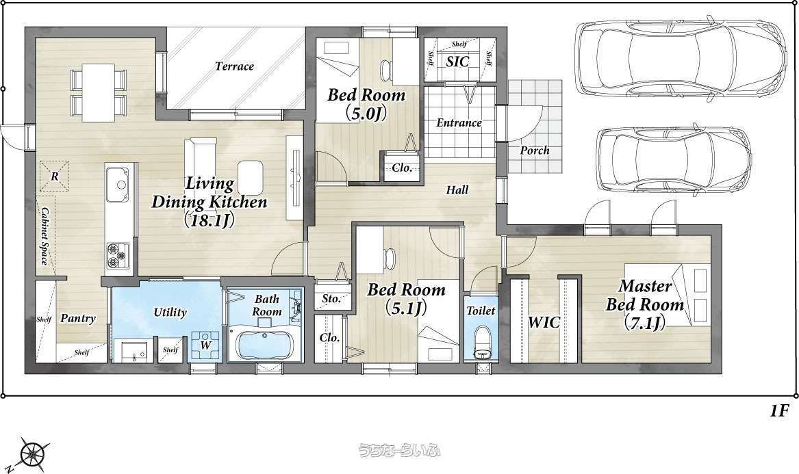| 間取り | 3LDK ( 洋7.1 洋5.1 洋5 LDK18.1 ※平屋、LDK18帖以上、ウォークインクローゼット、テラス付) | ||