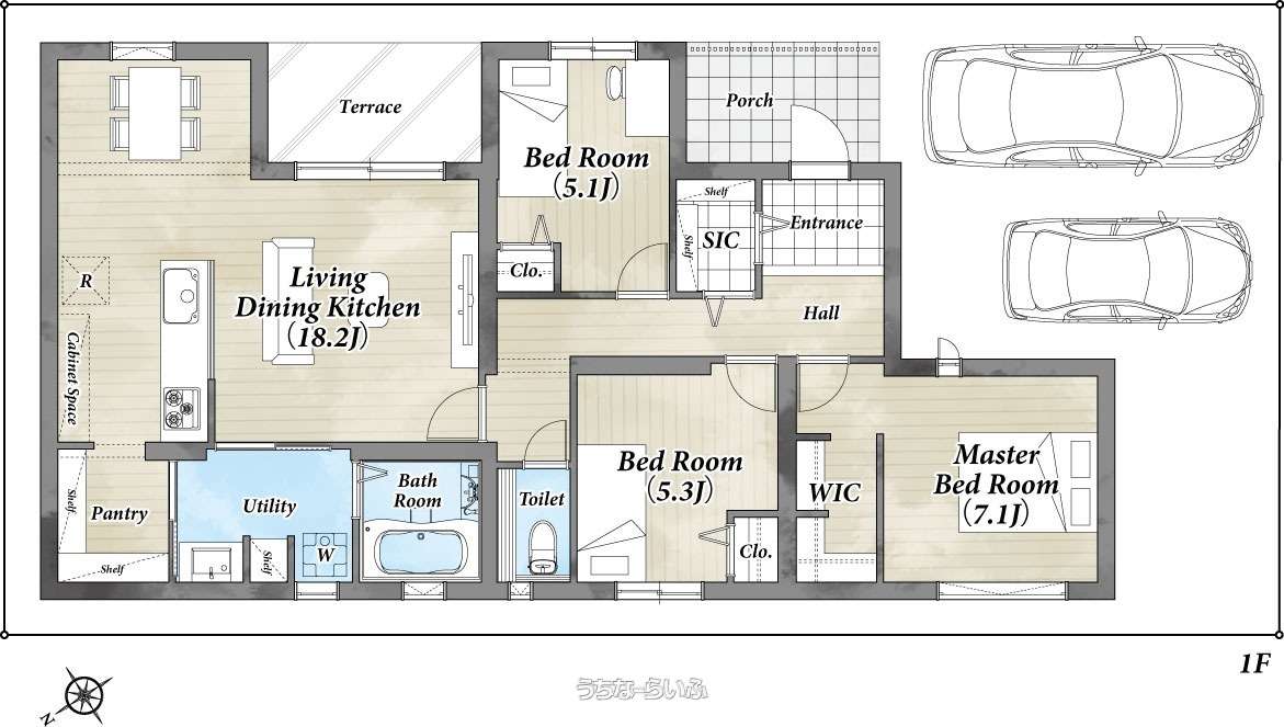 | 間取り | 3LDK ( 洋7.1 洋5.3 洋5.1 LDK18.2 ※平屋、LDK18帖以上、ウォークインクローゼット、テラス付) | ||