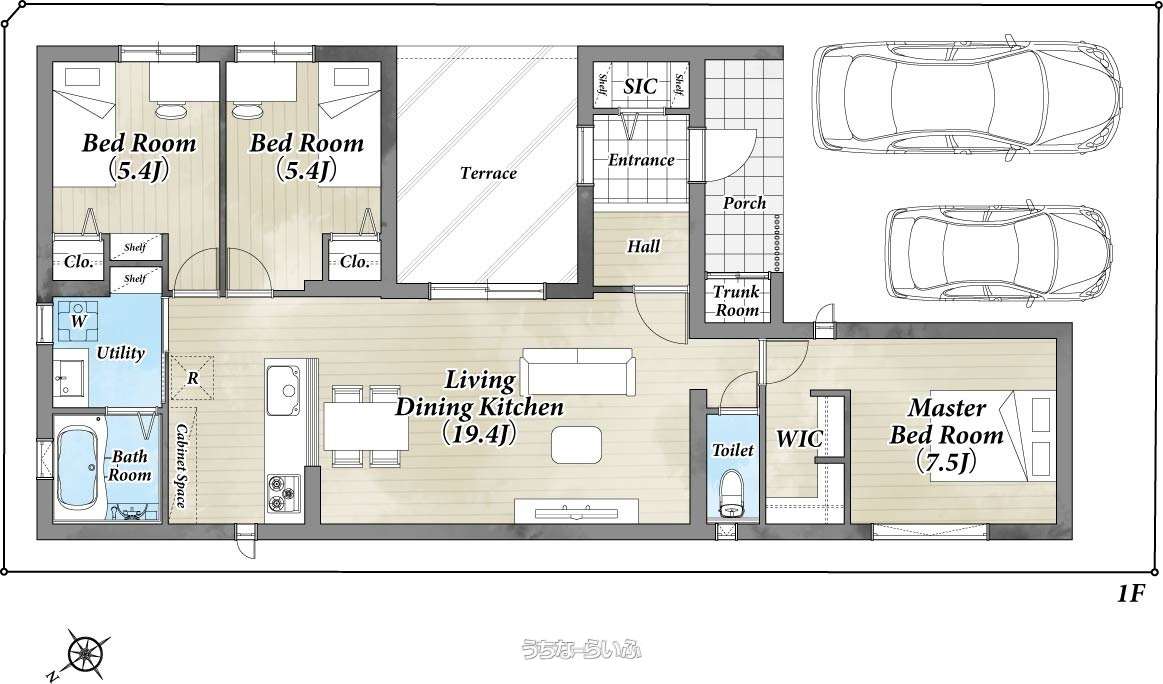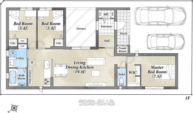 | 間取り | 3LDK ( 洋7.5 洋5.4 洋5.4 LDK19.4 ※平屋、LDK18帖以上、ウォークインクローゼット、テラス付) | ||