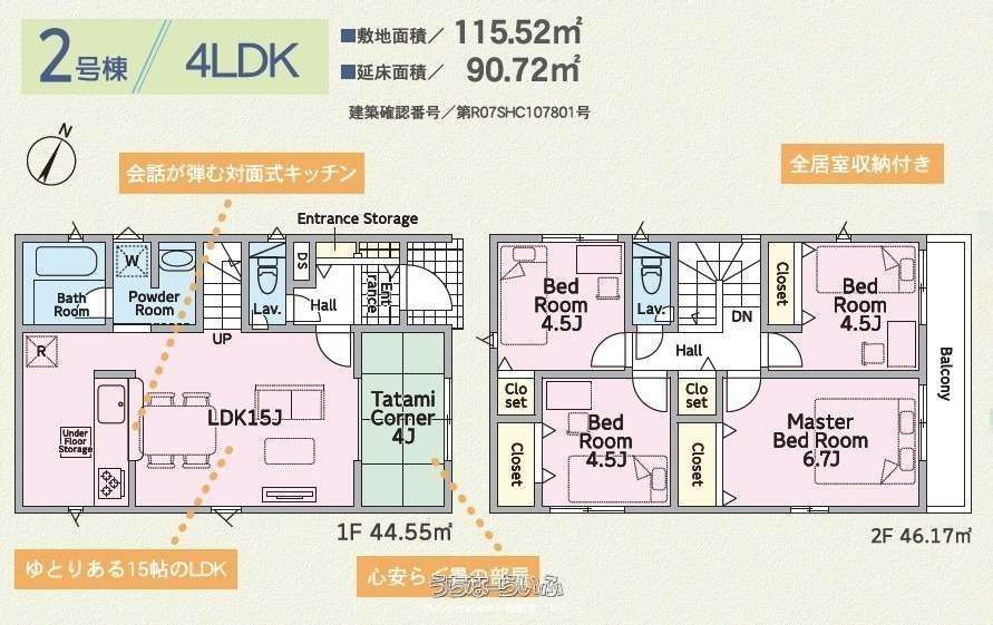 | 間取り | 4LDK ( 洋6.7 洋4.5 洋4.5 洋4.5 LDK15 ※その他 玄関(玄関収納)/4畳たたみコーナー/洗面脱衣所(洗面化粧台)/浴室(追い炊き機能、浴室乾燥機)/トイレ2か所/バルコニー/駐車場) | ||