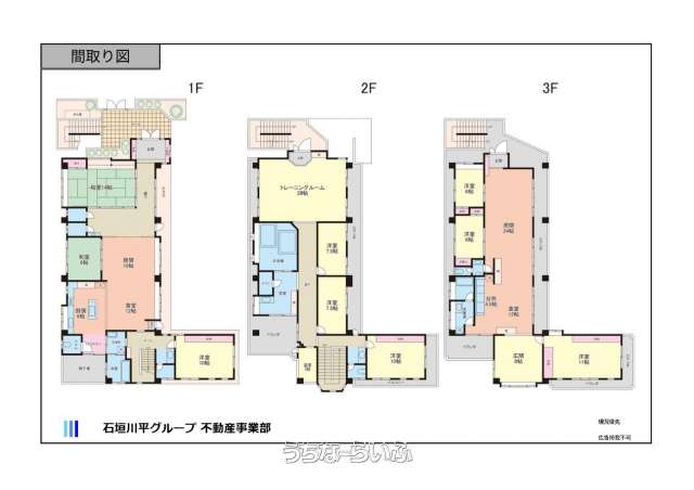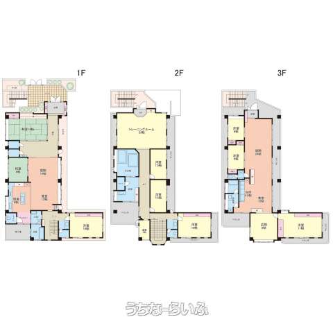 | 間取り | 10LDK ( 洋11 洋10 洋10 洋8 洋7.5 洋7.5 洋6 洋6 和14 和6 LDK28 ※1階のLDKは28帖。2階にはトレーニングルーム28帖あり。3階のLDKは40.5帖。) | ||