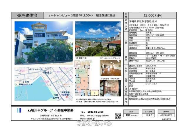 【石垣市 登野城】730交差点まで徒歩5分 オーシャンビュー 大浴場とサウナあり10LLDDKK 宿泊施設に最適 ご融資の斡旋を行っております