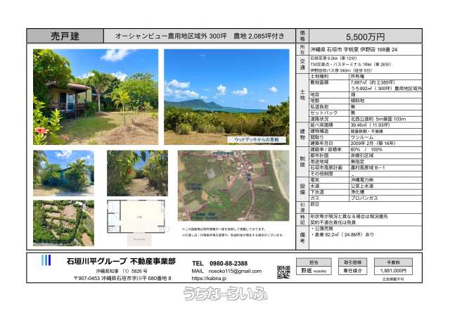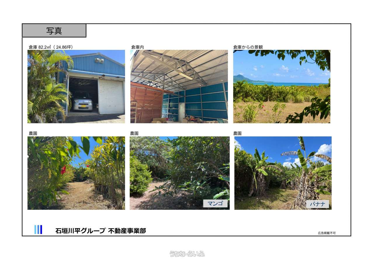 | 備考 | 石垣空港 9.2km(車12分) 730交差点・バスターミナル 18㎞(車 26分) 農園にはバナナ・マンゴ・シークワーサーなどの果樹あり 隣地8400坪の農地を別掲載中 IT重要事項説明・電子契約対応 ■現況: 所有者居住中 |