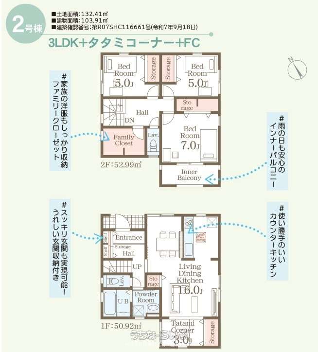 | 収納 | ウォークインクローゼット 、 シューズインクローク 、 シューズボックス 、 床下収納 、 全居室収納 |