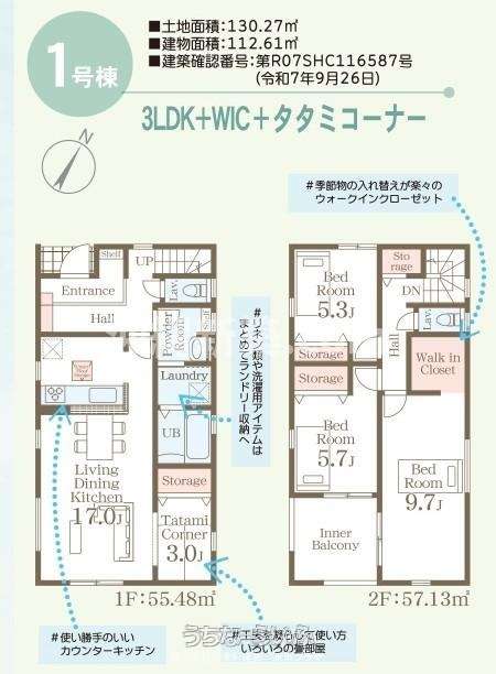 | 間取り | 3LDK ( 洋9.7 洋5.7 洋5.3 LDK17 ※家族の暮らしやすさを考えた、使い勝手の良い間取りです。\n対面キッチンを中心に、LDKは家族が自然と集まりやすい設計。\n各居室に収納を確保し、日々の生活がすっきり整います。) | ||