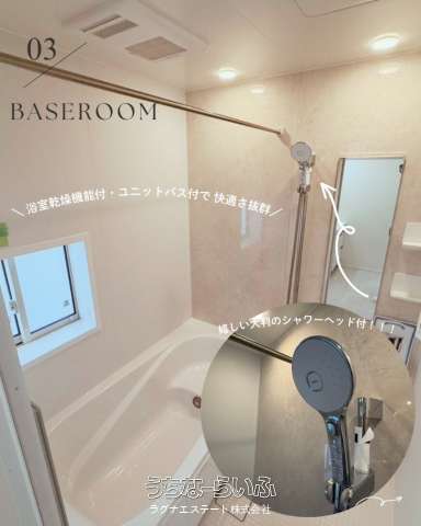 | バス・トイレ | バス/トイレ別 、 ユニットバス 、 浴槽 、 シャンプードレッサー 、 独立洗面所 、 追焚機能 、 浴室乾燥機 、 浴室1坪以上 、 浴室暖房 、 トイレ2ヶ所 、 温水洗浄便座 |