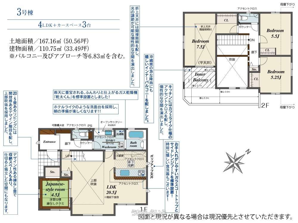 | 建物面積 | 110.75m² / 33.5坪 | 土地面積 | 167.16m² / 50.56坪 |