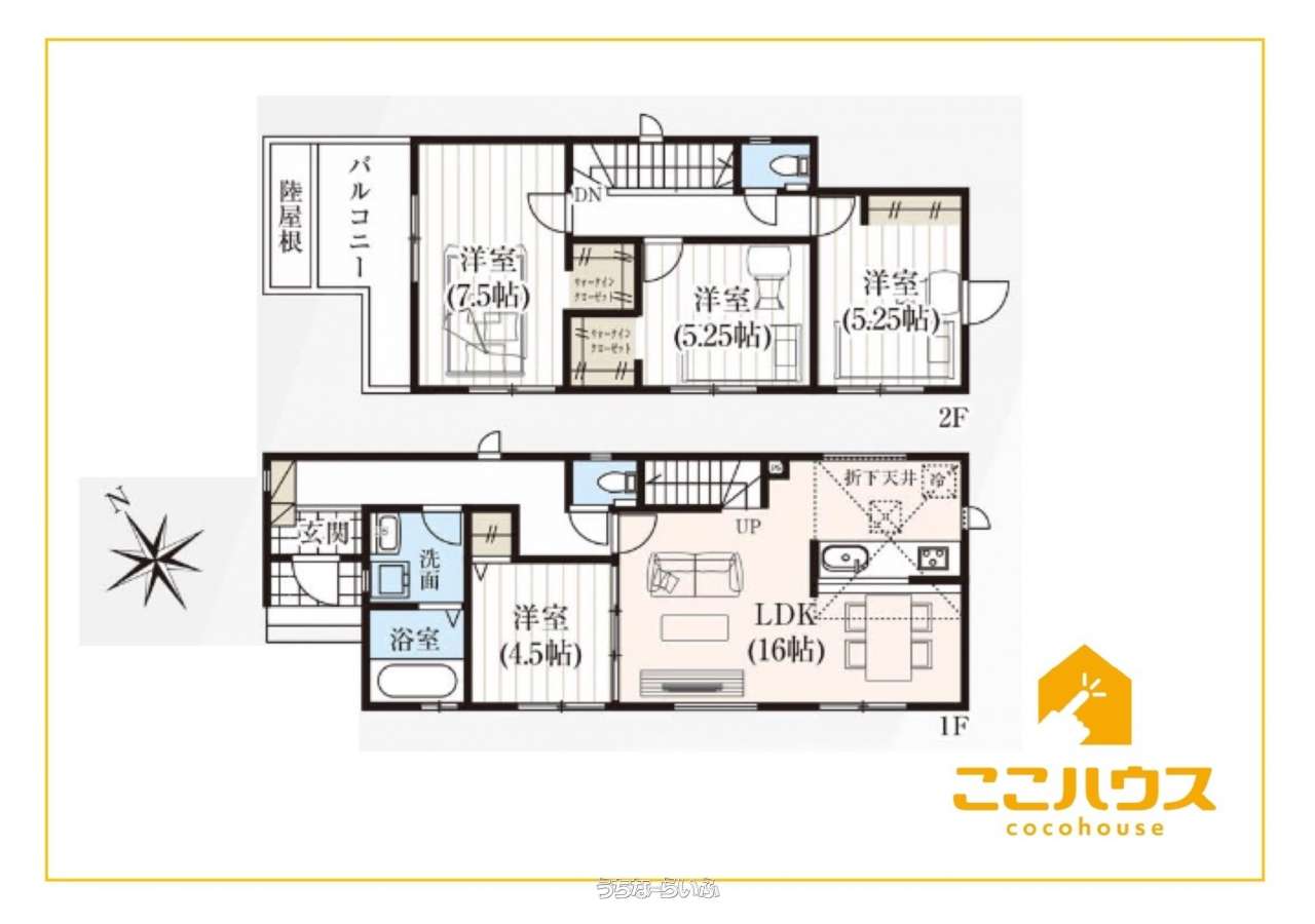 | 間取り | 4LDK ( 洋4.5 洋7.5 洋5.2 洋5.2 LDK16 ※ウォークインクローゼット×2箇所、全居室収納、オープンキッチン) | ||