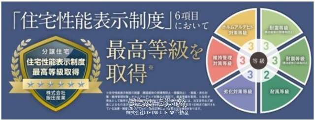 | 評価・証明書 | 設計住宅性能評価書 、 建設住宅性能評価書(新築時) 、 フラット35・S適合証明書あり 、 完了検査済証 |