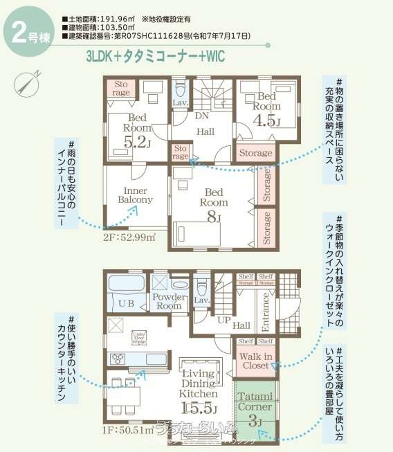 | 建物面積 | 103.5m² / 31.3坪 | 土地面積 | 191.96m² / 58.06坪 |