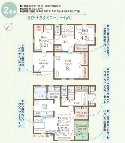 | 間取り | 3LDK ( 洋8 洋5.2 洋4.5 LDK15.5 ※タタミコーナー(3帖)・2FWIC付き・インナーバルコニー) | ||