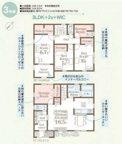 | 間取り | 3LDK ( 洋6.7 洋6 洋5 LDK16.5 ※ストレージルーム付き・2F/WIC付き・インナーバルコニー) | ||