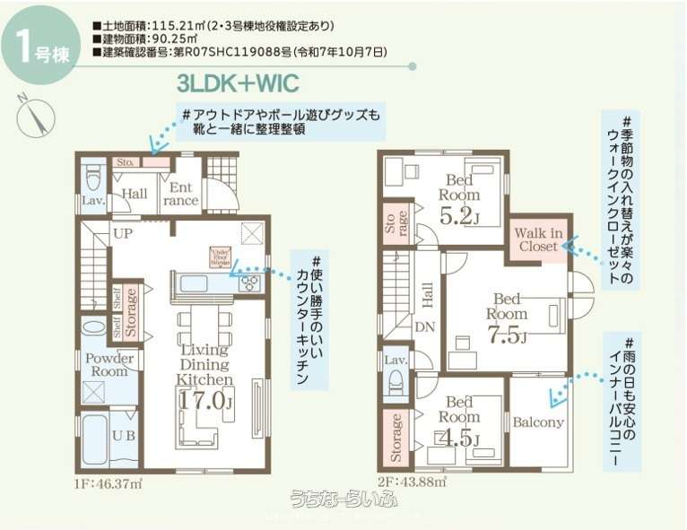 | 間取り | 3LDK ( 洋7.5 洋5.2 洋4.5 LDK17 ※2F/WIC・バルコニー) | ||