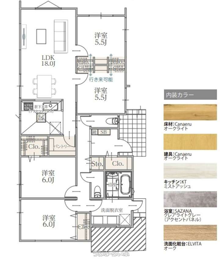 | 間取り | 4LDK ( 洋5.5 洋5.5 洋6 洋6 LDK18 ※1F/大容量キッチンパントリー付き・大容量クローゼット・洗面台2台・トイレ2ヶ所・洗濯物干し) | ||