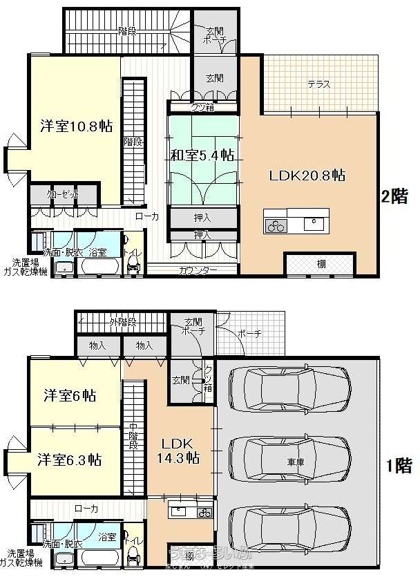 | 間取り | 4LDK ( 洋10.8 洋6.3 洋6 洋5.3 LDK20.8 ※1階:洋6.3・洋6・LDK14.3 2階:洋10.8・和5.3・LDK20.8 3階2LDK ) | ||