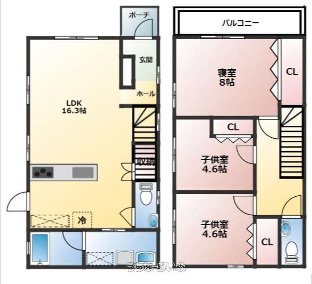 | 間取り | 3LDK ( 洋8 洋4.6 洋4.6 LDK16.3 ※階段下収納、シューズボックス、バルコニー) | ||