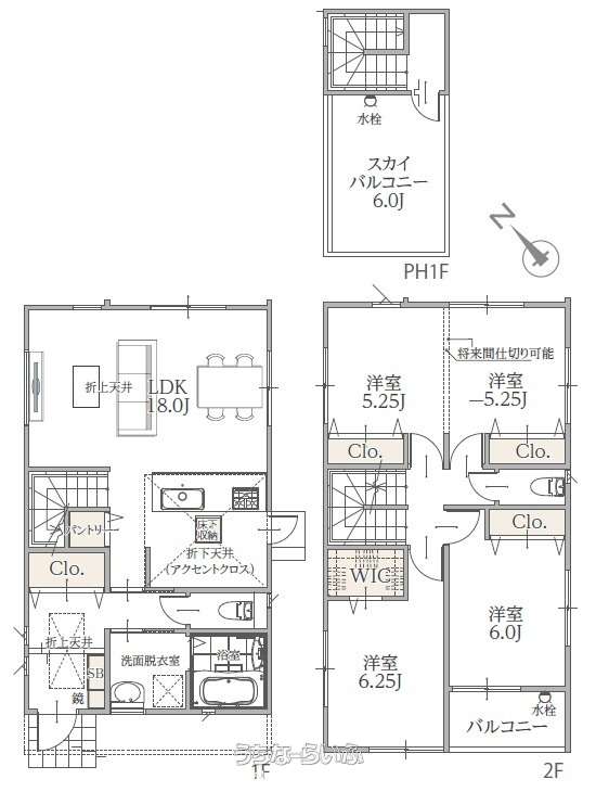 間取り | 3LDK ( 洋6 洋6.3 洋10.5 LDK18 ※ウォークインクローゼット、パントリー、床下収納、トイレ2ヵ所、食器洗浄乾燥機、スカイバルコニー6帖) | ||
