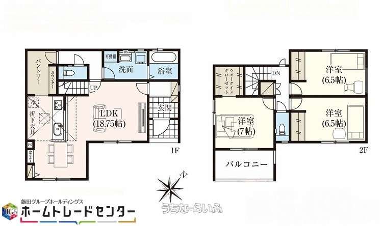 | 間取り | 3LDK ( 洋7 洋6.5 洋6.5 LDK18.8 ※リビングイン階段 床下収納、パントリー(カウンター付)、WICトイレ2ヵ所、バルコニー) | ||