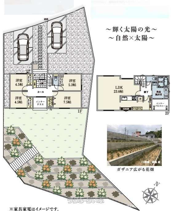 | 間取り | 4LDK ( 洋7.5 洋5.2 洋4.5 洋4.5 LDK23.6 ※床下収納、システムキッチン、洗浄便座、モニター付インターホン、人感センサーライト、24時間換気システム、シックハウス対策、トイレ2ヵ所、インナーバルコニー) | ||