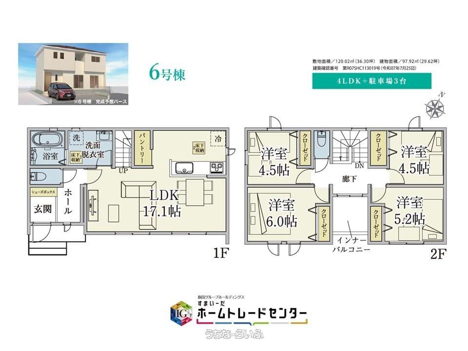 | 間取り | 4LDK ( 洋6 洋5.2 洋4.5 洋4.5 LDK17.1 ※床下収納、全居室収納完備、インナーバルコニー採用、) | ||