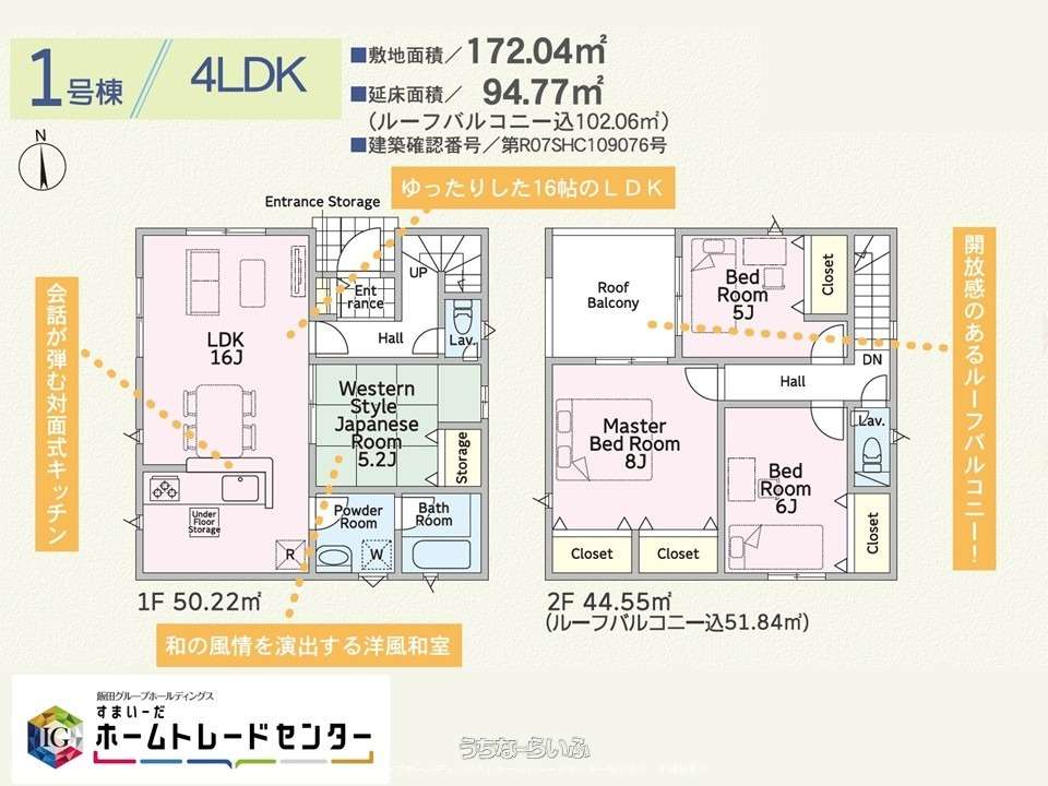 | 間取り | 4SLDK ( 洋5 洋6 洋8 和5.2 SLDK16 ※全室収納付き、バルコニー、床下収納、トイレ2ヵ所、全居室フローリング、前面道路6m以上、照明器具、システムキッチン、洗浄便座、カウンターキッチン、トイレ2ヶ所、LDK15帖以上、ルーフバルコニー) | ||