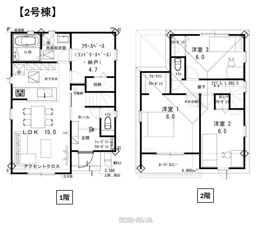 | 間取り | 3LDK ( 洋6 洋6.5 洋8 LDK15 ※床下収納、全居室収納完備、ルーフバルコニー、折下天井、アクセントクロス、シューズインクローゼット、WIC) | ||