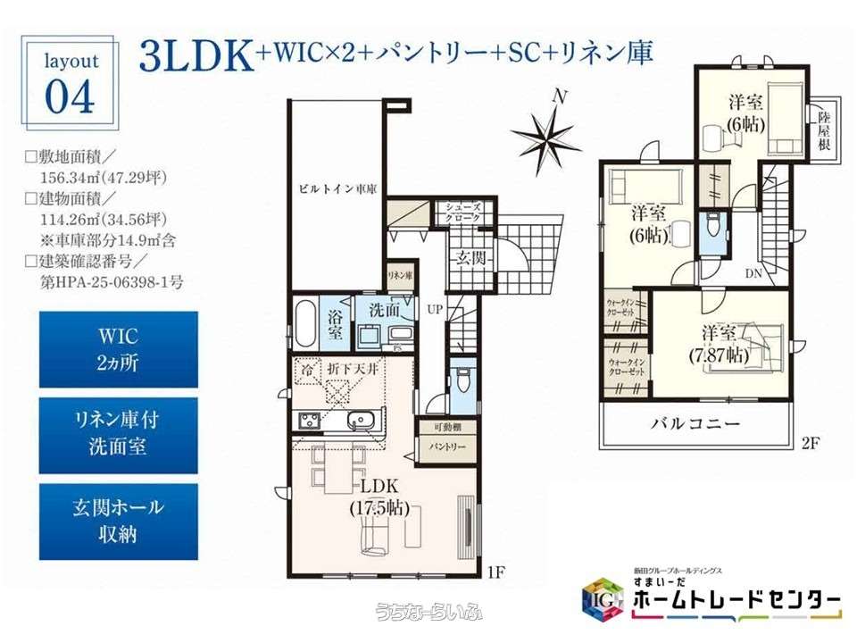 | 間取り | 3LDK ( 洋6 洋6 洋7.9 LDK17.5 ※床下収納、トイレ2ヵ所、バルコニー、全居室収納、ビルトインガレージ、シューズクローク、廊下収納、リネン庫付き洗面室、稼働棚付きパントリー、WIC×2) | ||